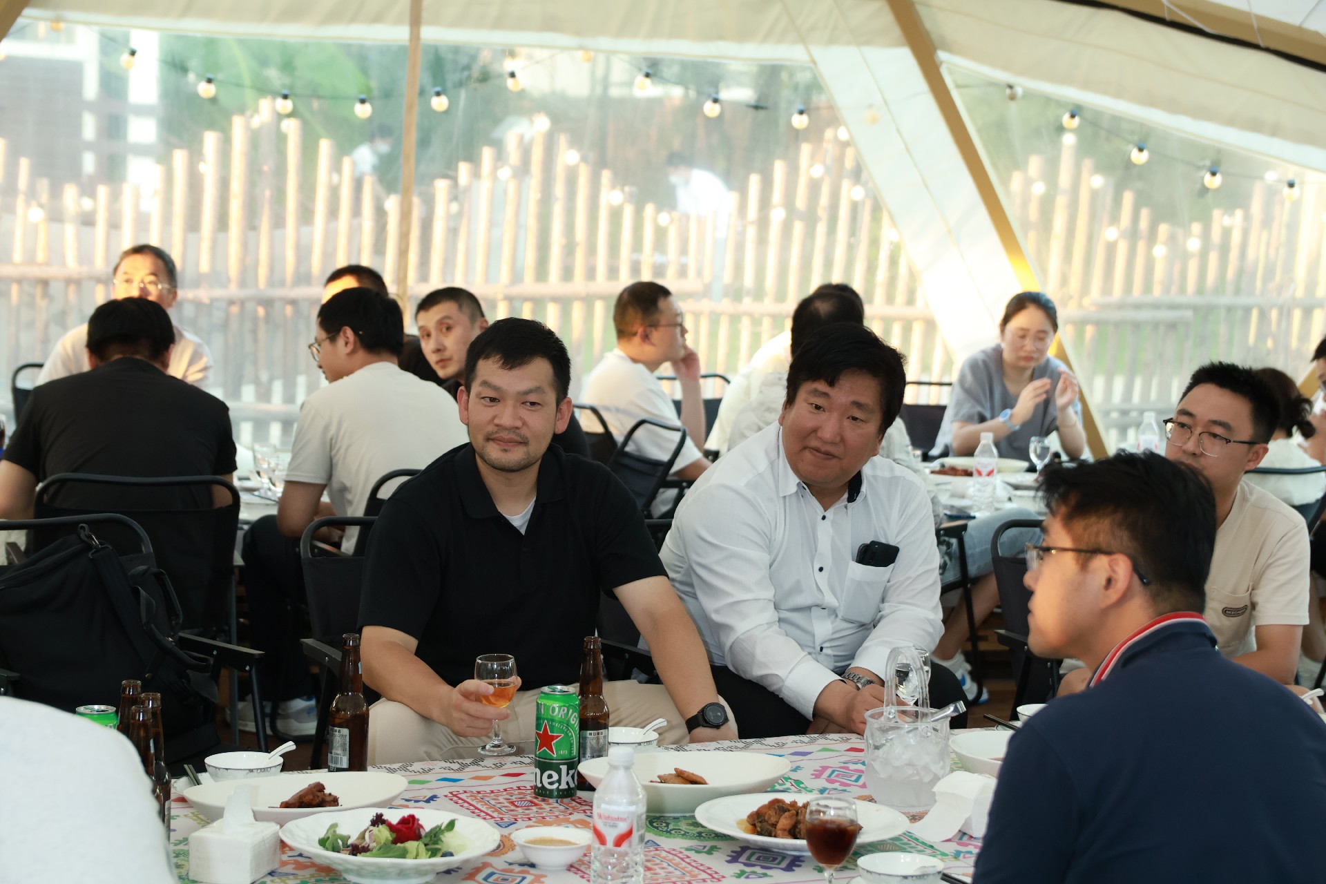 大家围坐餐桌,中餐的醇厚与烧烤的焦香交织碰撞,举杯畅谈间,工作的疲惫烟消云散。